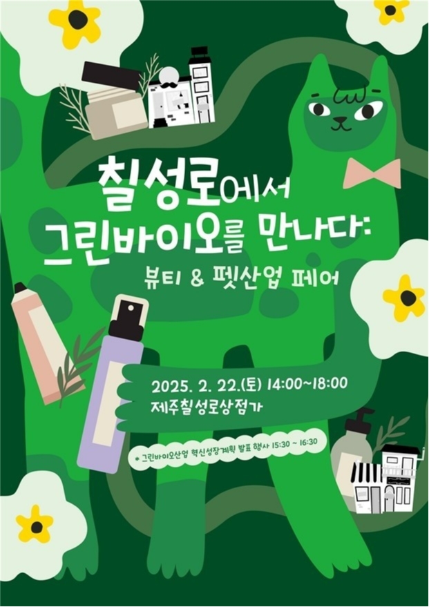 제주특별자치도와 제주지역혁신플랫폼 청정바이오사업단(제주RIS)은 오는 22일 제주시 칠성로 상점가에서 ‘칠성로에서 그린바이오를 만나다: 뷰티&펫산업 페어’를 개최한다고 밝혔다. 이번 행사는 제주의 청정 자연을 활용한 그린바이오산업 혁신성장 전략을 알리고, 지역 바이오기업들의 우수한 제품을 홍보하기 위해 마련됐다.