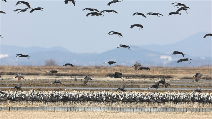 세계적인 철새도래지인 충남 서산 천수만에서 국제적 보호종이자 천연기념물인 흑두루미 약 4천여 마리가 장관을 이루며 눈길을 사로잡고 있다.