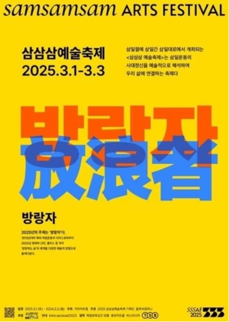 제4회 삼삼삼예술축제가 3·1운동 106주년을 기념해 오는 3월 1일부터 3일까지 서울 명동 삼일로창고극장 주변에서 열린다. 올해 축제의 주제는 ‘방랑자’로, 독립운동을 위해 국경을 넘었던 이들, 전쟁과 억압 속에서 삶의 터전을 떠나야 했던 사람들, 그리고 오늘날 세계 각지에서 난민으로 살아가는 이들의 삶을 다양한 예술적 형식으로 조명할 예정이다.