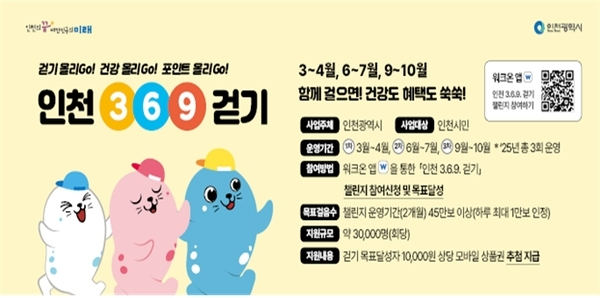 ‘인천 3.6.9 걷기 챌린지’는 시민들이 하루 7천 보 이상 걷기를 실천하도록 돕는 건강 증진 프로그램으로, 모바일 앱 ‘워크온’을 활용해 목표 걸음 수를 달성한 시민에게 1만 원 상당의 모바일 문화상품권을 제공하는 방식으로 운영된다.