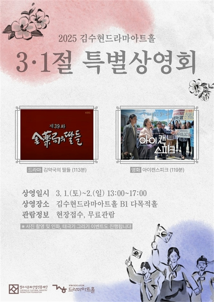청주시문화산업진흥재단이 운영하는 김수현드라마아트홀이 3·1절을 기념해 일제강점기를 배경으로 한 작품들을 선보이는 특별상영회를 개최한다고 밝혔다.