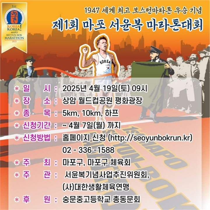 서울 마포구는 오는 4월 19일 월드컵공원에서 ‘제1회 마포 서윤복 마라톤 대회’를 개최한다고 밝혔다. 이번 대회는 한국 마라톤의 전설 서윤복 선수를 기리며 그의 업적을 널리 알리고자 마련됐다.