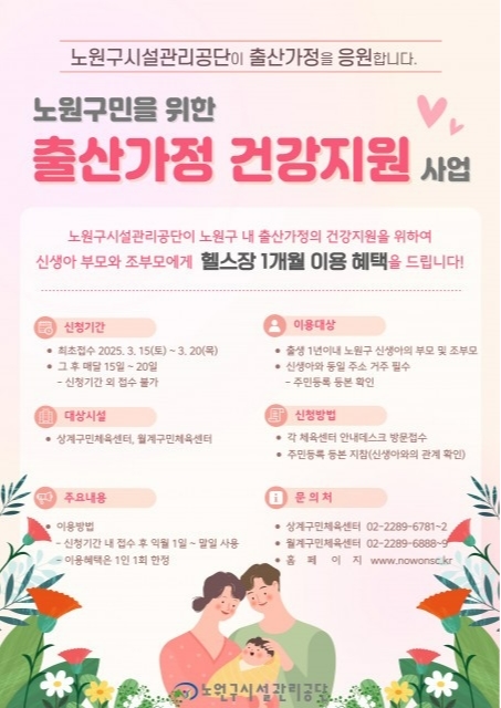 김주성 노원구시설관리공단 이사장은 “아이를 양육하는 부모와 조부모의 건강이 가정의 안정과 복지에 중요한 요소인 만큼 이번 무료 이용 혜택이 건강한 육아 환경 조성에 도움이 되길 바란다”며 “앞으로도 지역 주민의 건강 증진을 위한 다양한 프로그램과 지원 사업을 적극적으로 추진하겠다”고 말했다.