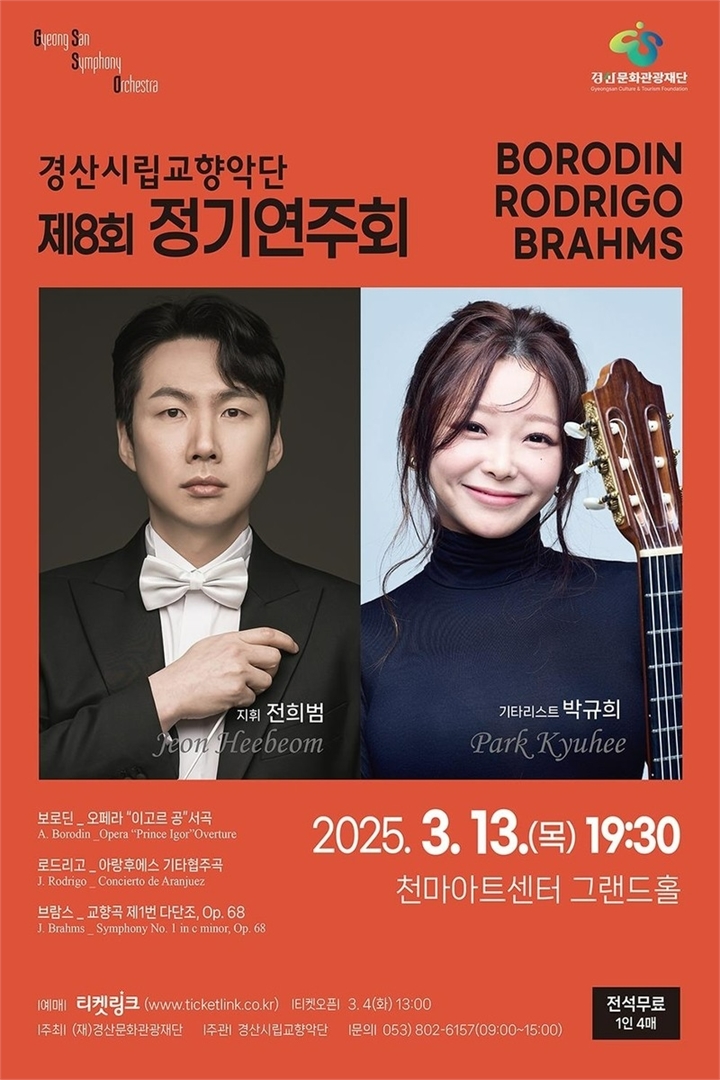 경산시립교향악단은 이번 정기연주회를 통해 시민들에게 수준 높은 클래식 공연을 선사할 계획이다. 공연은 전석 무료로 진행되며, 관람을 희망하는 시민은 오는 12일 오후 1시까지 티켓링크를 통해 사전 예약하면 된다.