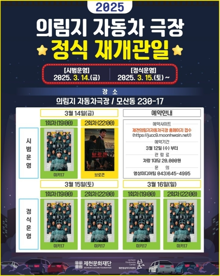 제천문화재단 김호성 상임이사는 “이번 재개관을 통해 의림지 자동차극장뿐만 아니라 인근 맛집과 카페 등 지역 상권에도 활력을 불어넣기를 기대한다”며 “제천 유일의 개봉 영화관으로 많은 관심을 부탁드린다”고 전했다.