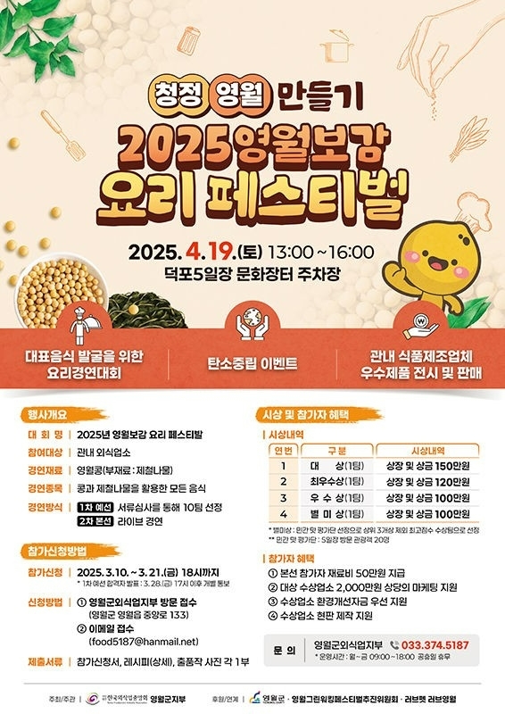 강원 영월군외식업지부는 지역 농산물 소비 촉진과 음식문화 활성화를 위해 ‘2025년 영월보감 요리 페스티벌’을 개최한다고 밝혔다. 이번 대회는 영월을 대표하는 특산물인 콩과 제철 나물을 활용한 요리를 주제로 하며, 지역 내 등록된 외식업소라면 누구나 참가할 수 있다.