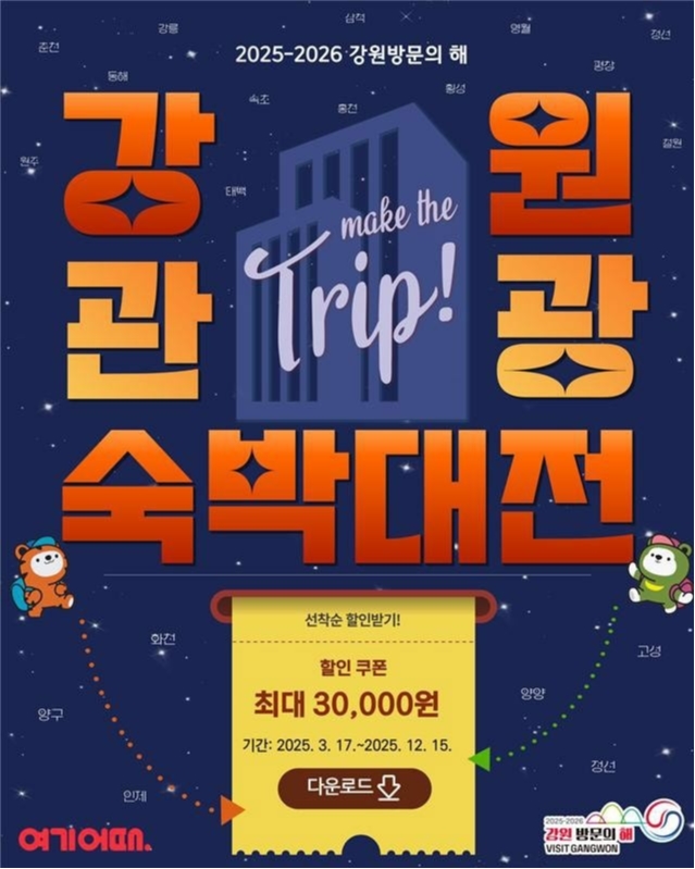 강원도 18개 시군과 강원관광재단은 숙박 예약 플랫폼 ‘여기어때’와 협력해 오는 17일 오전 10시부터 연말까지 ‘강원 관광 숙박 대전’을 진행한다고 밝혔다.