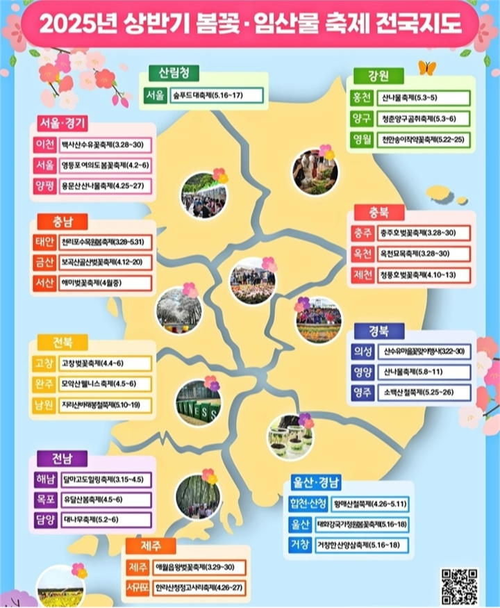 산림청이 전국의 산림과 관련된 축제 정보를 한눈에 확인할 수 있는 2025년 상반기 봄꽃·임산물 축제 전국지도를 발간했다고 밝혔다.