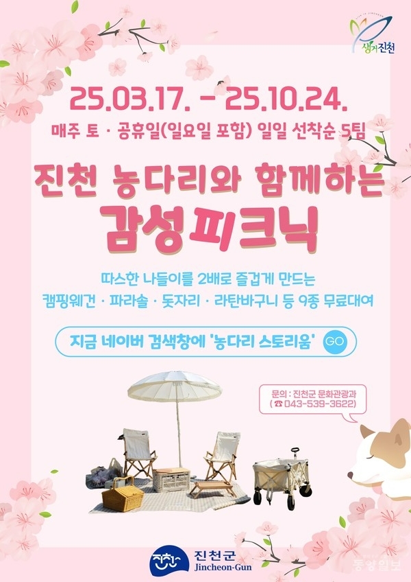 정민기 진천군 문화관광과 주무관은 “나들이를 떠날 때마다 준비물을 챙겨야 하는 번거로움이 있지만, 농다리에서는 설렘만 안고 오시면 된다”며 “매주 다채로운 문화 공연도 열리는 만큼 많은 분들이 방문해 즐겨주시길 바란다”고 전했다.