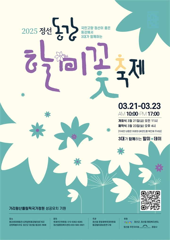 개막일인 21일에는 정선군립아리랑예술단의 식전 공연을 시작으로 공식 개막행사와 ‘할미데이’ 선포식이 진행된다. 또한, 버스킹 공연, 그림 공모전 시상식, 동강할미꽃 화분 만들기 체험, 노르딕 워킹 등 풍성한 프로그램이 마련돼 방문객들에게 특별한 경험을 선사할 예정이다.
