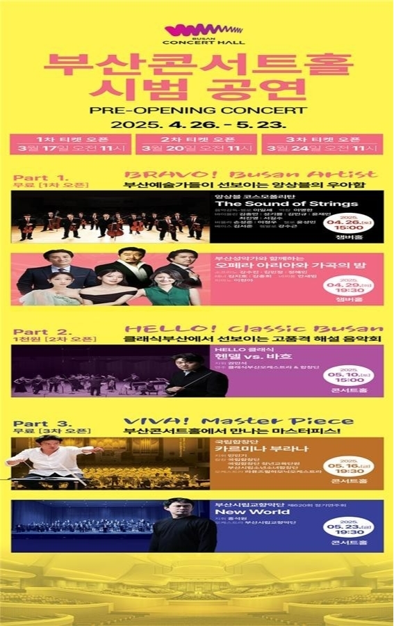 부산시 ‘클래식부산’이 오는 6월 부산콘서트홀 개관을 앞두고 4월 26일부터 5월 26일까지 시범 공연을 개최한다. 이번 시범 공연은 시민들에게 새로운 문화공간을 미리 선보이는 동시에, 공연장 음향과 시스템을 점검하기 위한 자리로 마련됐다.