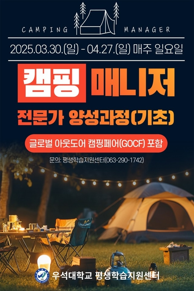 캠핑산업 종사자나 캠핑에 관심이 있는 주민이라면 누구나 신청할 수 있으며, 참가비는 전액 무료다. 자세한 사항은 우석대학교 평생학습지원센터(063-290-1742)로 문의하면 된다.