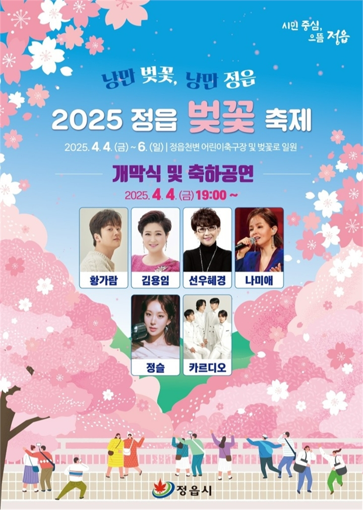 정읍의 대표적인 봄 축제인 ‘2025 정읍벚꽃축제’가 오는 4월 4일부터 6일까지 정읍천 벚꽃로와 정읍천 일원에서 열린다. ‘낭만벚꽃, 낭만정읍’을 주제로 한 이번 축제는 만개한 벚꽃과 함께 다양한 문화·체험 프로그램을 즐길 수 있는 힐링 축제로 꾸며진다.