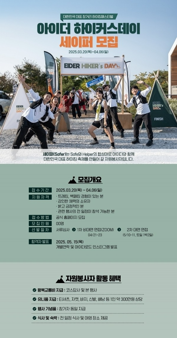 자원봉사자 신청은 3월 20일부터 4월 6일까지 아이더 공식 홈페이지에서 접수할 수 있으며, 서류 심사와 1·2차 면접을 거쳐 최종 선발된 인원은 5월 15일 발표된다.