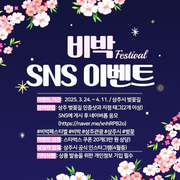 경북 상주시는 오는 29일 열리는 ‘상상주도 비박페스티벌’과 연계해 ‘비박페스티벌과 함께하는 상주 벚꽃길 SNS 인증 이벤트’를 진행한다고 밝혔다. 이번 이벤트는 모든 세대가 참여하고 소통할 수 있는 소셜 마케팅의 일환으로, 상주의 대표적인 벚꽃 명소를 널리 알리는 데 목적을 두고 있다.