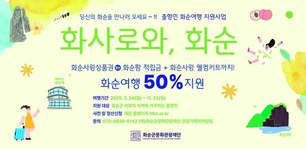 화순군문화관광재단(이사장 구복규)은 3월 24일부터 출향인을 대상으로 한 여행 지원사업 ‘화사로와, 화순’을 시작하고 참가 신청을 받는다고 밝혔다.
