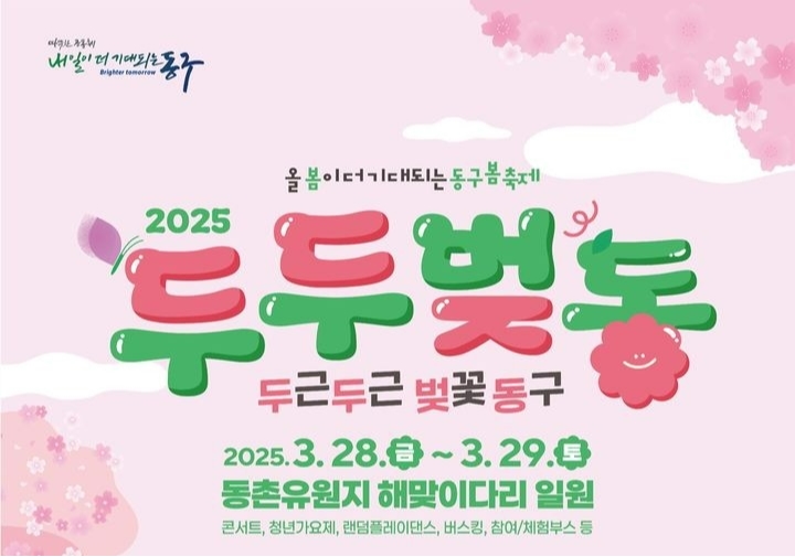 동구청은 오는 3월 28일부터 29일까지 이틀간 동촌유원지 해맞이 다리 일원에서 ‘2025 동구 봄 축제 두두벚동’을 개최한다고 밝혔다. ‘두두벚동’은 ‘두근두근 벚꽃 동구’의 줄임말로, 동구가 벚꽃 시즌을 맞아 새롭게 기획한 축제다.