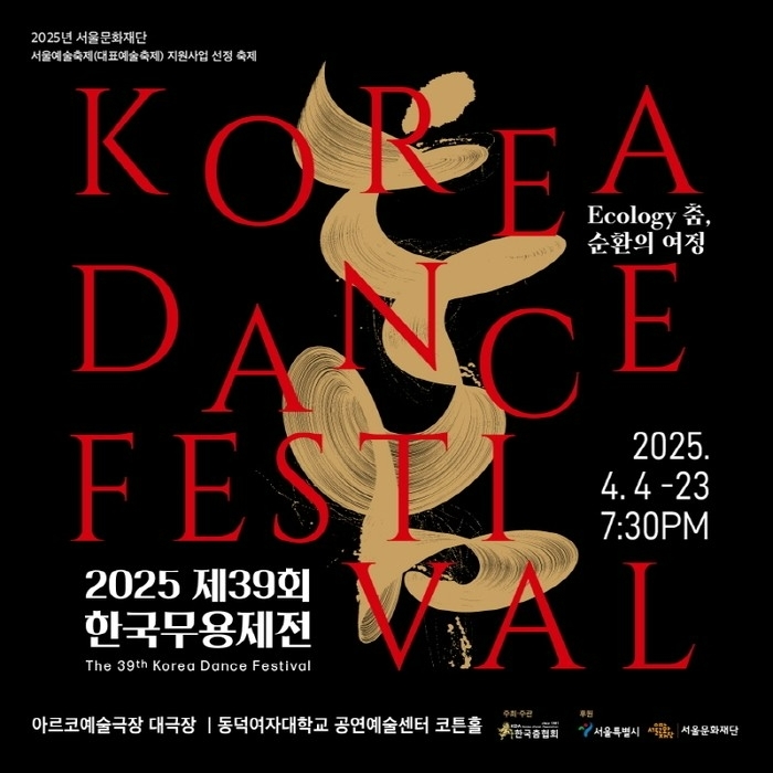 사단법인 한국춤협회(이사장 윤수미 동덕여자대학교 교수)는 오는 4월 4일부터 23일까지 ‘제39회 한국무용제전’을 개최한다. 한국 창작춤계를 대표하는 공연예술축제인 이번 행사는 아르코예술극장 대극장과 동덕여자대학교 공연예술센터 코튼홀에서 진행되며, ‘Ecology 춤, 순환의 여정’을 주제로 다양한 무대와 부대행사가 펼쳐질 예정이다.