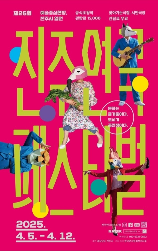 제26회 진주연극페스티벌이 오는 4월 5일부터 12일까지 진주시 일원에서 개최된다. 올해 축제는 지역민들의 공연예술 향유 기회를 확대하고 도시재생 및 지역 문화예술 발전에 기여하기 위해 기획됐으며, 진주 예술중심현장을 비롯해 초장1지구 물빛공원, 충무공동 물초울공원, 진주문고, 푸른마을작은도서관 등 다양한 공간에서 펼쳐진다.