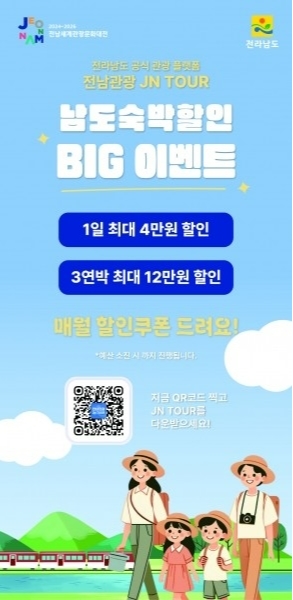 지원 금액은 숙박 요금에 따라 차등 적용되며, △10만 원 이상 결제 시 4만 원 △7만 원 이상 3만 원 △5만 원 이상 2만 원이 할인된다. 이 혜택은 시·군별 월 1회, 최대 3일까지 재방문 시에도 적용 가능하다. 또한, ‘전남사랑애 서포터즈’로 인증된 이용객에게는 1만 원이 추가 할인된다.