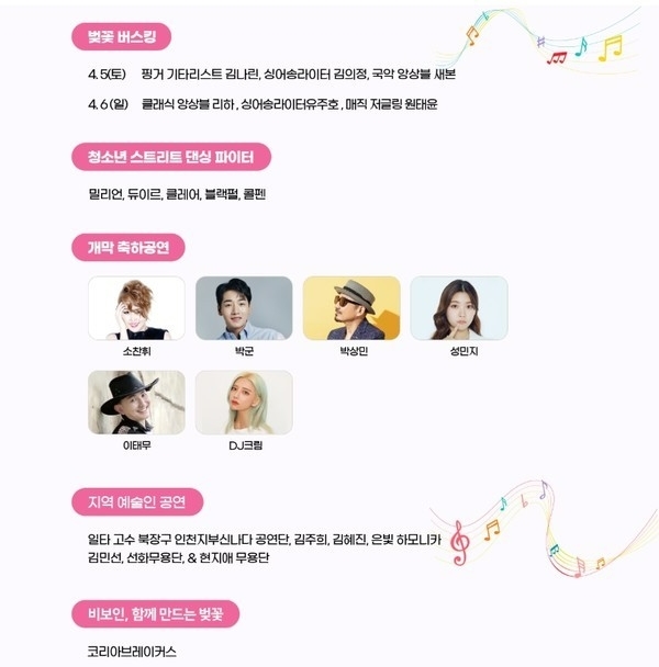 특히 4월 5일 저녁 7시에 열리는 개막 축하공연에서는 가수 소찬휘, 박군, 박상민, 성민지, 이태무, DJ 크림 등 유명 아티스트들이 무대에 올라 축제의 열기를 더할 예정이다. 이어 4월 6일 저녁 7시에는 감미로운 재즈 콘서트가 펼쳐져 벚꽃과 함께하는 낭만적인 분위기를 연출하며 축제의 대미를 장식한다.