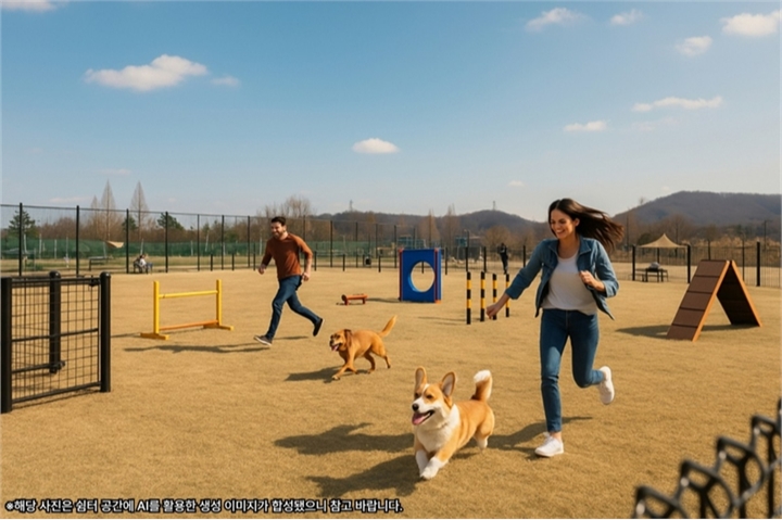 이번에 마련된 쉼터는 가족 쉼터(3천㎡)와 반려견 동반 쉼터(1천300㎡)로 구성됐다. 넓은 천연잔디 위에 반려견과 보호자가 함께 산책하며 휴식을 즐길 수 있도록 설계되었으며, 반려견 놀이공간과 가족 쉼터가 나란히 배치됐다. 특히, 반려견 공간은 대형견과 중·소형견 구역으로 분리해 안전성을 높였으며, 허들, 터널, 계단, 링 던지기 등 다양한 놀이기구를 설치해 반려견들이 자유롭게 뛰어놀 수 있도록 했다.