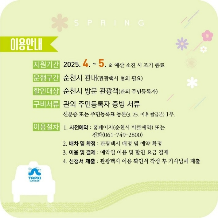 순천시가 4월부터 5월까지 봄철 관광객을 대상으로 '순천 관광택시 봄맞이 반값 할인 이벤트'를 진행한다. 이번 이벤트는 관광객들의 편의를 높이고 지역 관광을 활성화하기 위한 취지로 마련됐으며, 이용 요금의 50%를 지원한다. 단, 예산 소진 시 조기 종료될 수 있다.