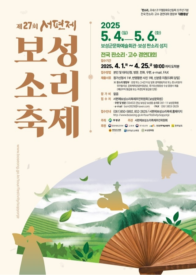 한편, 전국 판소리·고수 경연대회 참가 희망자는 참가신청서와 증빙자료를 오는 4월 25일 오후 6시까지 서편제보성소리축제추진위원회에 제출해야 한다. 보다 자세한 내용은 보성문화원에 문의하거나 서편제보성소리축제 공식 홈페이지를 통해 확인할 수 있다.