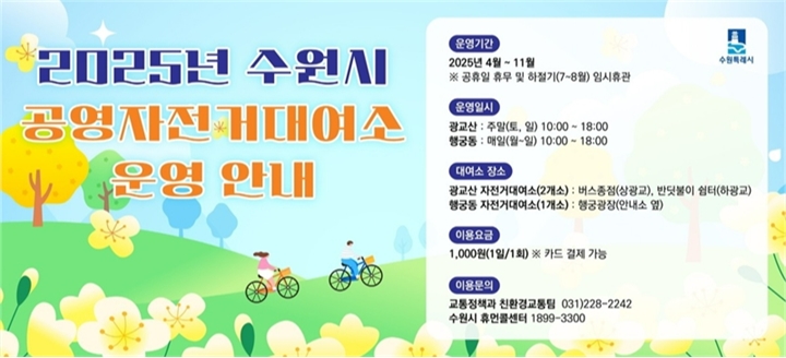 수원시 관계자는 “공영자전거를 이용하면 광교산의 아름다운 자연과 세계문화유산 수원화성을 더욱 가까이에서 즐길 수 있다”며 “친환경 교통수단인 자전거를 적극 활용해 건강한 여가를 보내길 바란다”고 전했다.
