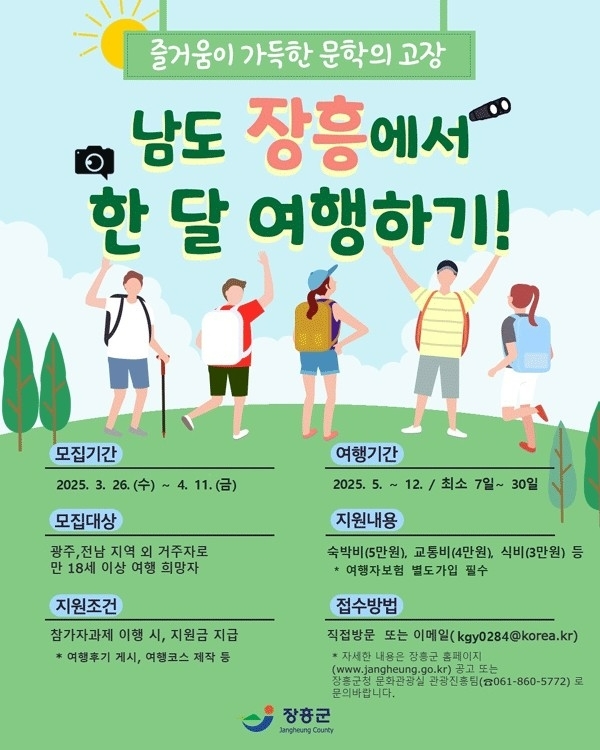 장흥군이 3월 26일부터 4월 11일까지 ‘장흥에서 한 달 여행하기’ 참가자를 모집한다. 이 사업은 장기 체류 여행자에게 여행 경비를 지원하는 대신 참가자가 개인 SNS 등을 통해 장흥 여행을 홍보하는 방식으로 운영된다.