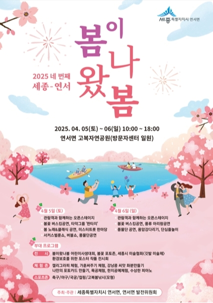 세종시 연서면에서 봄의 정취를 만끽할 수 있는 축제가 열린다. 연서면발전위원회(공동위원장 한재현·김학용)는 오는 4월 5일부터 6일까지 고복자연공원에서 ‘2025 네 번째 세종-연서 봄이 왔나봄’ 축제를 개최한다고 밝혔다.