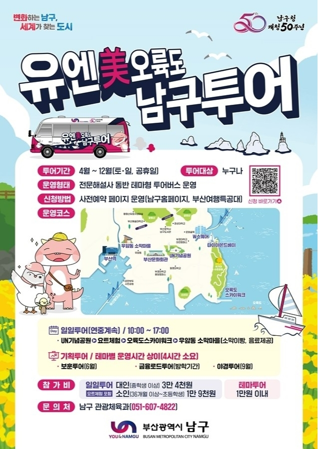 부산 남구가 지역 대표 관광지들을 한 번에 즐길 수 있는 테마형 탐방 프로그램 ‘유엔미 오륙도 남구 투어버스’를 오는 4월 5일부터 12월까지 본격 운영한다. 이번 투어는 남구의 주요 역사·문화 거점을 잇는 일일 투어로, 전문 해설사의 해설과 함께 보다 깊이 있는 관광 경험을 제공한다.
