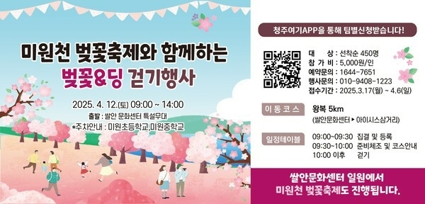 걷기행사 참가 신청은 4월 6일까지 ‘청주여기’ 모바일앱을 통해 가능하며, 선착순 450명으로 마감된다. 참가비는 1인당 5천 원이며, 참가자에게는 미원천 벚꽃축제 마을장터에서 사용할 수 있는 국수 쿠폰(5천 원 상당)이 지급된다. 쿠폰은 행사 당일에만 사용 가능하다.