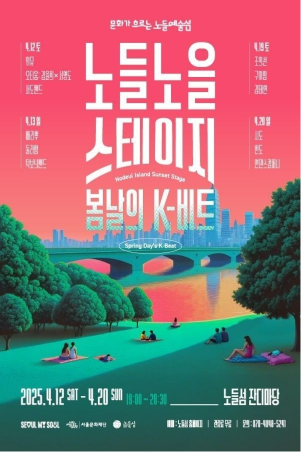 서울문화재단이 오는 4월 12일부터 20일까지 총 4일간 노들섬 잔디마당과 노들스퀘어 일대에서 ‘노들노을스테이지’ 축제를 개최한다. ‘봄날의 K-비트’를 슬로건으로 내건 이번 축제는 자연과 어우러지는 야외 공연을 통해 국악, 팝, 컨템퍼러리 등 다양한 장르의 한국 음악을 무료로 선보인다.