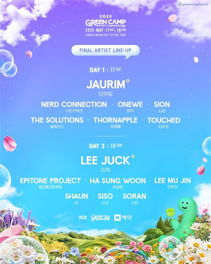 음악, 캠핑, 피크닉이 어우러지는 대표적인 야외 음악 축제 ‘그린캠프페스티벌 2025’가 오는 5월 17~18일 양일간 인천 송도 달빛축제공원에서 열린다. 슬로건은 ‘일상에 특별한 순간’으로, 강렬한 사운드와 감성적인 무대를 아우르는 최종 라인업이 공개되며 기대감을 높이고 있다.