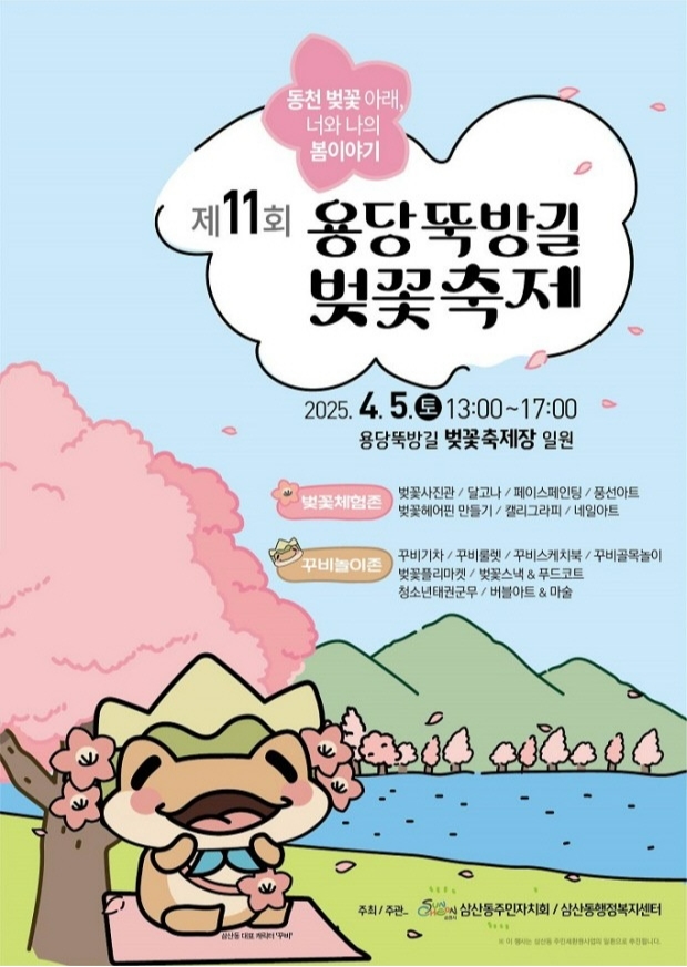 ‘동천 벚꽃 아래, 너와 나의 봄 이야기’를 주제로 열리는 이번 축제는 오후 1시부터 5시까지 용당뚝방길 일원에서 만개한 벚꽃을 배경으로 차분한 분위기 속에 진행된다.