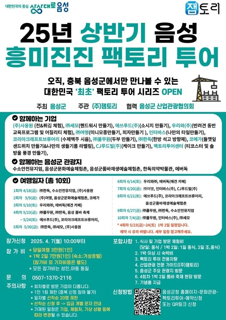 음성군 관계자는 “다양한 체험형 공장 방문을 통해 산업 현장의 매력을 널리 알리고, 지역 관광 활성화에도 기여할 것으로 기대한다”고 전했다.
