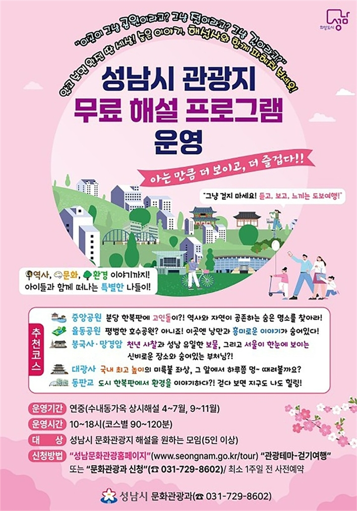 성남시는 시민과 관광객이 지역의 역사와 문화를 깊이 있게 체험할 수 있도록 관광지 무료 해설 프로그램을 연중 운영한다고 밝혔다.