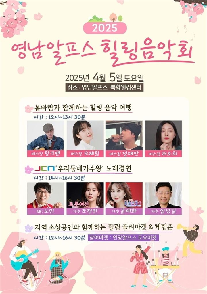 울산시 울주군은 오는 4월 5일, 영남알프스 복합웰컴센터 야외광장에서 ‘2025 영남알프스 힐링음악회’를 개최한다고 밝혔다. 이번 행사는 관광객과 지역 주민이 함께 즐길 수 있는 문화 축제로, 따뜻한 봄날의 자연 속에서 다양한 음악과 즐길 거리를 선사할 예정이다.