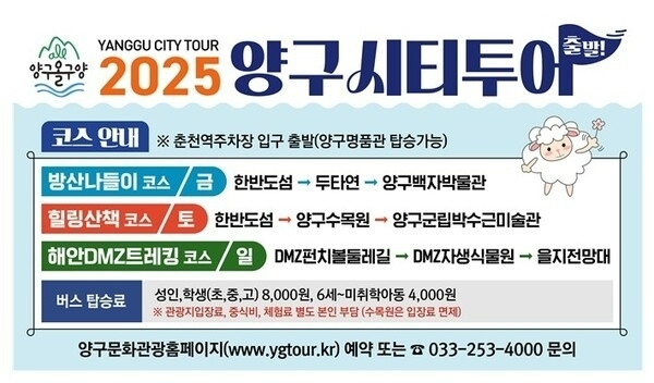 양구군은 수도권 관광객을 대상으로 한 ‘광역시티투어 힐링·산책코스’도 이달 중 별도로 운영할 계획이다. 이명옥 관광문화과장은 “올해 시티투어는 양구만의 매력을 담은 다양한 테마로 구성됐다”며 “지속적으로 특색 있는 관광 콘텐츠를 발굴해 다시 찾고 싶은 여행지로 만들겠다”고 밝혔다.