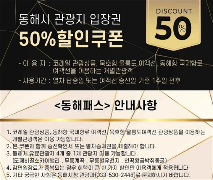 이 쿠폰은 여객선 터미널과 동해역에서 확인 절차를 거쳐 배부받을 수 있으며, 여객선 승선일 또는 열차 탑승일을 기준으로 1주일 전후 기간 내에 사용할 수 있다.