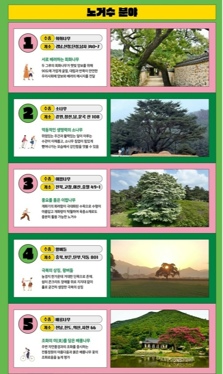 보호수 분야에서는 강원 영월의 소나무, 광주 서구의 왕버들, 서울 송파의 느티나무, 강원 인제의 돌배나무, 부산 기장의 곰솔이 뽑혔으며, 노거수 분야에서는 경남 산청의 회화나무, 강원 정선의 소나무, 전북 고창의 이팝나무, 충북 보은의 왕버들, 전남 진도의 배롱나무가 선정됐다.