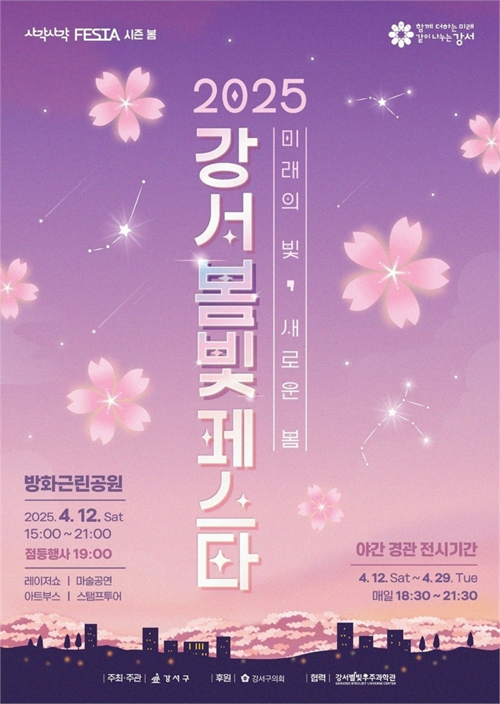 서울 강서구가 오는 4월 12일 토요일 오후, 방화근린공원에서 ‘2025 강서 봄빛페스타’를 개최한다. 이 축제는 ‘미래의 빛, 새로운 봄’을 주제로, 빛 조형물에 미디어아트와 인공지능 기술을 접목한 이색적인 야간 축제로 펼쳐진다.