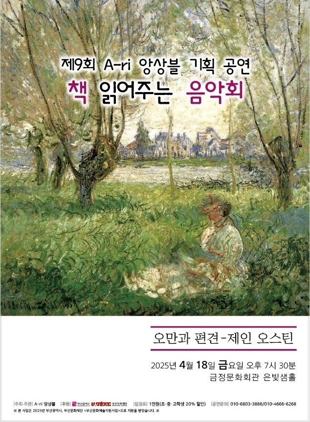 부산 출신 청년 연주자와 경력 단절 여성 연주자들로 구성된 ‘A-ri 앙상블’이 오는 4월 18일 오후 7시 30분 금정문화회관에서 특별한 책 읽어주는 음악회를 연다. 이번 공연은 영국 작가 제인 오스틴 탄생 250주년을 기념해 그녀의 대표작 오만과 편견을 테마로 한다.