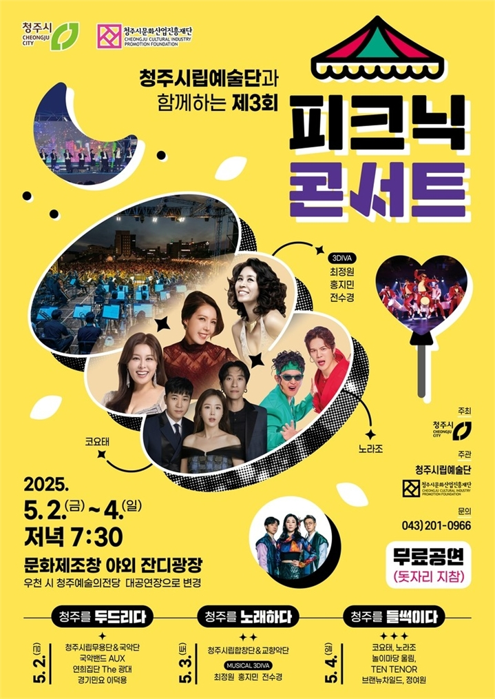 청주시 문예운영과 윤남용 과장은 “올해도 많은 시민들이 함께 즐길 수 있도록 풍성한 무대를 준비했다”며 “피크닉 콘서트를 통해 잊지 못할 감동과 즐거움을 만끽하시길 바란다”고 전했다.