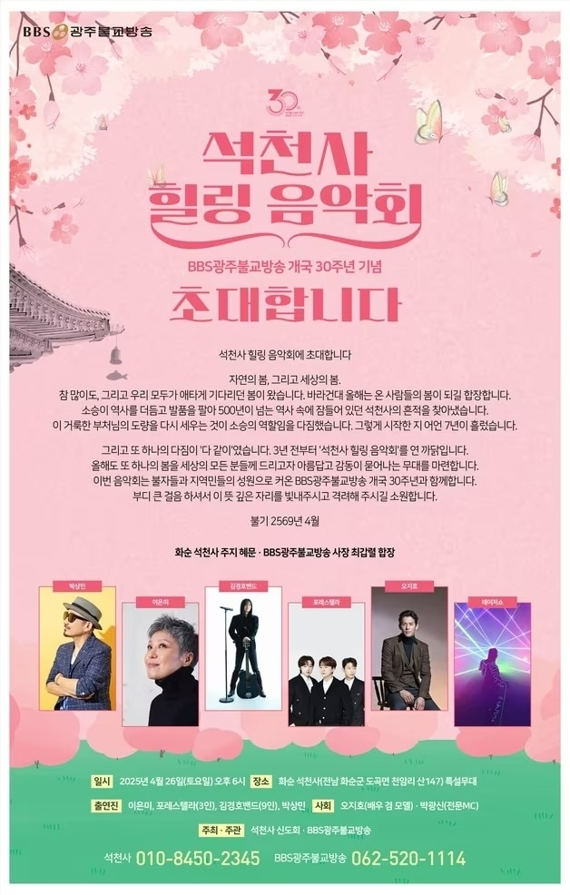 오는 4월 26일 오후 6시, 화순군 도곡면 중봉산 자락 석천사 특설무대에서 ‘BBS광주불교방송 개국 30주년 기념 석천사 힐링 음악회’가 개최된다. 고려 후기 창건돼 19세기 중엽 폐사한 이후 500년의 세월을 잠들어 있던 석천사는 현재 중창불사에 돌입해 새로운 도약을 준비 중이다.