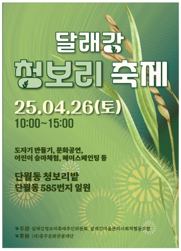 새봄의 시작을 알리는 이번 축제는 달천강과 청보리의 초록빛 물결을 배경으로 걷기 행사, 다채로운 공연, 체험 부스, 팜파티, 모빌리티 마켓 등 남녀노소 모두가 즐길 수 있는 풍성한 프로그램이 마련된다.