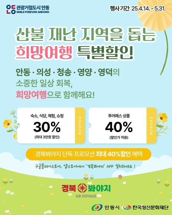 안동시는 산불 피해로 특별재난지역으로 선포된 경북 북부 5개 시군을 대상으로 ‘희망여행 기획전’을 오는 5월 31일까지 운영한다고 밝혔다. 이번 행사는 경북 북부 11개 시군을 연계한 온라인 여행 플랫폼 ‘경북 봐야지(GB VOYAGE)’를 통해 진행되며, 지역 관광 활성화와 침체된 지역 경제 회복을 위한 특별 프로모션으로 마련됐다.