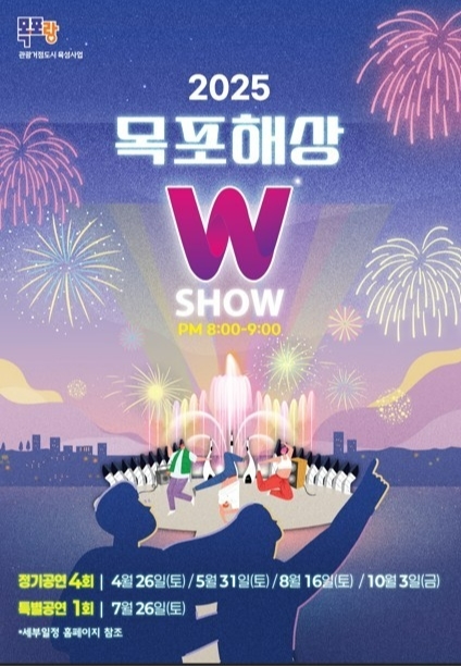 한편, 목포시는 이번 4월 개막 공연을 시작으로 5월 31일, 7월 26일, 8월 16일, 10월 3일까지 총 5회에 걸쳐 평화광장 일원에서 ‘목포 해상W쇼’를 진행할 계획이다.