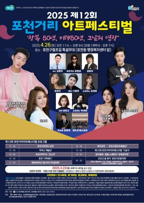 포천시가 오는 4월 26일(토) '광복 80주년, 미래 80년, 그날의 영광'을 주제로 '제12회 포천거리아트페스티벌'을 개최한다. 이번 행사는 포천동 행정복지센터 앞 구절초길 특설무대에서 오전 11시부터 오후 9시 30분까지 진행되며, 개막식은 오후 7시에 열린다.
